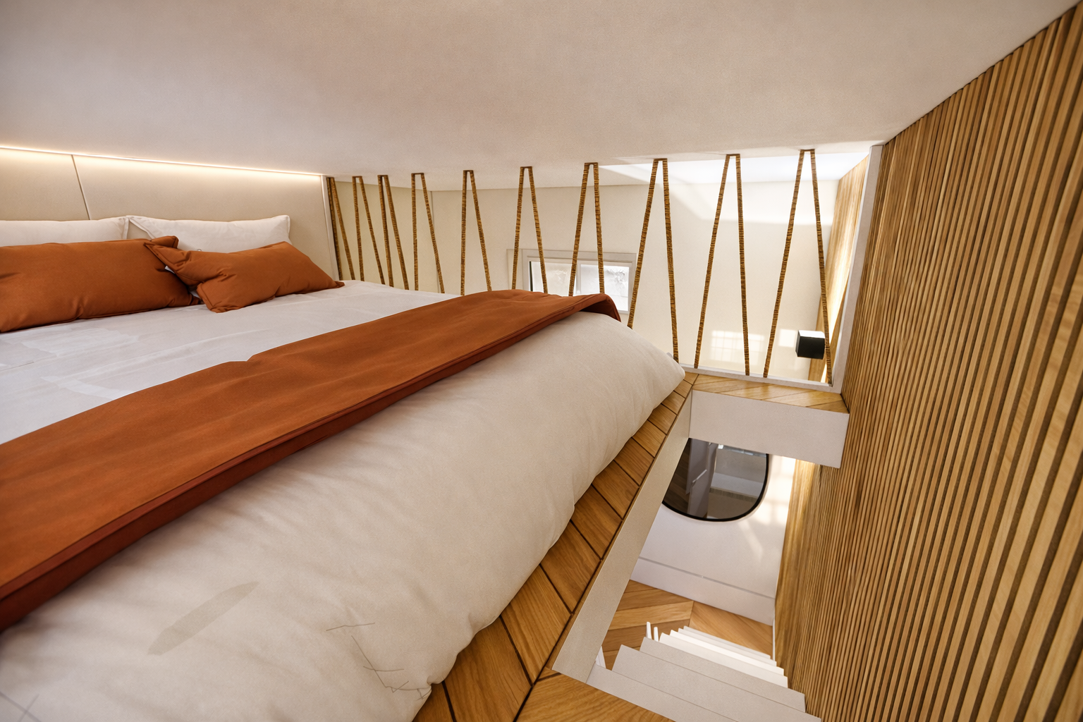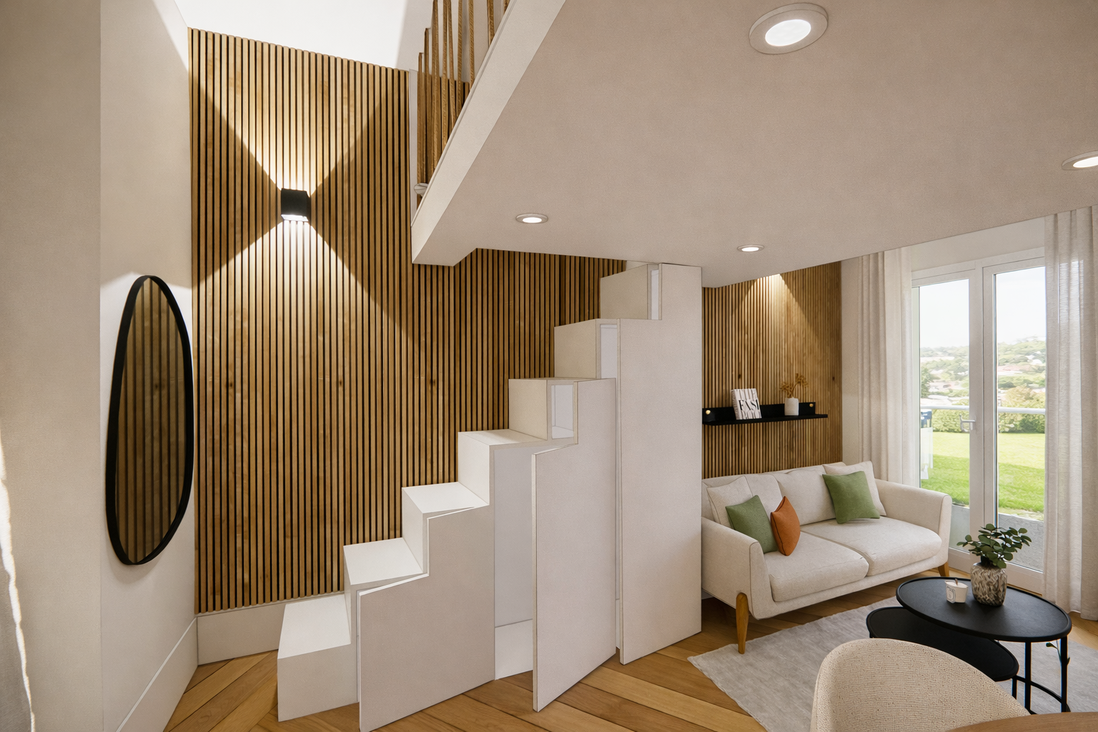 - Un escalier avec rangements intégrés pour optimiser la surface.
